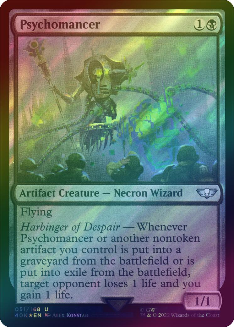 PsychomancerCasting Cost: Card Type: Artifact Creature - Necron WizardPower/Toughness: 1/1Card Text: Flying Harbinger of Despair - Whenever this creature or another nontoken artifact you control is put into a graveyard from the battlefield or is put into exile from the battlefield, target opponent loses 1 life and you gain 1 life.Artist: Alex Konstad