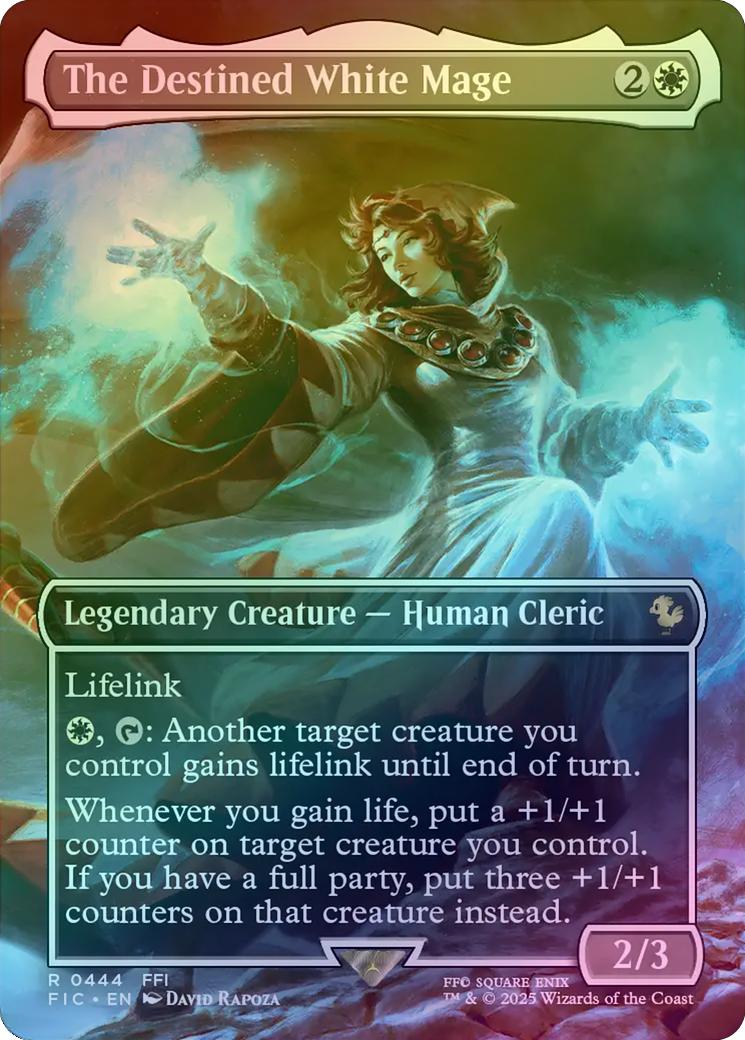 The Destined White MageCasting Cost: Card Type: Legendary Creature - Human ClericPower/Toughness: 2/3Card Text: Lifelink , : Another target creature you control gains lifelink until end of turn. Whenever you gain life, put a +1/+1 counter on target creature you control. If you have a full party, put three +1/+1 counters on that creature instead.Artist: David Rapoza