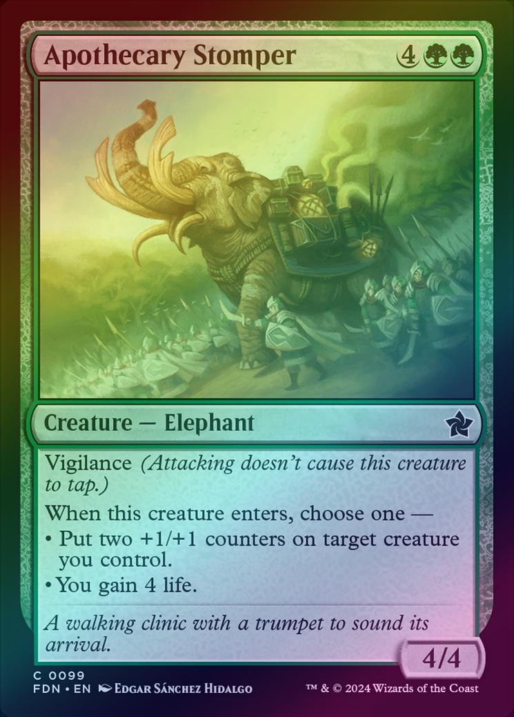 Apothecary StomperCasting Cost: Card Type: Creature - ElephantPower/Toughness: 4/4Card Text: Vigilance (Attacking doesn't cause this creature to tap.) When this creature enters, choose one - - Put two +1/+1 counters on target creature you control. - You gain 4 life.Flavour Text: A walking clinic with a trumpet to sound its arrival.Artist: Edgar Snchez Hidalgo