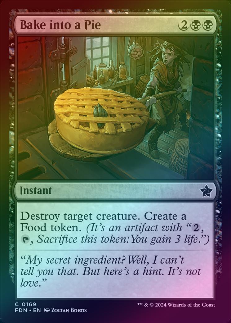 Bake into a PieCasting Cost: Card Type: InstantCard Text: Destroy target creature. Create a Food token. (It's an artifact with ", , Sacrifice this artifact: You gain 3 life.")Flavour Text: "My secret ingredient? Well, I can't tell you that. But here's a hint. It's not love."Artist: Zoltan Boros