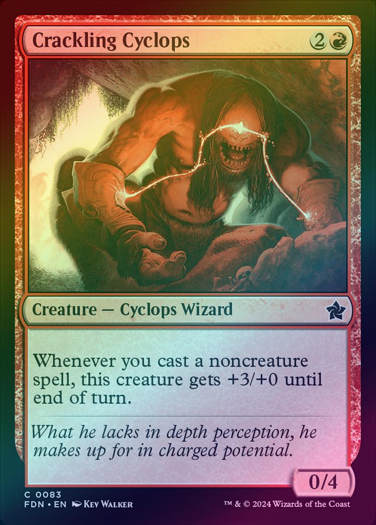 Crackling CyclopsCasting Cost: Card Type: Creature - Cyclops WizardPower/Toughness: 0/4Card Text: Whenever you cast a noncreature spell, this creature gets +3/+0 until end of turn.Flavour Text: What he lacks in depth perception, he makes up for in charged potential.Artist: Kev Walker