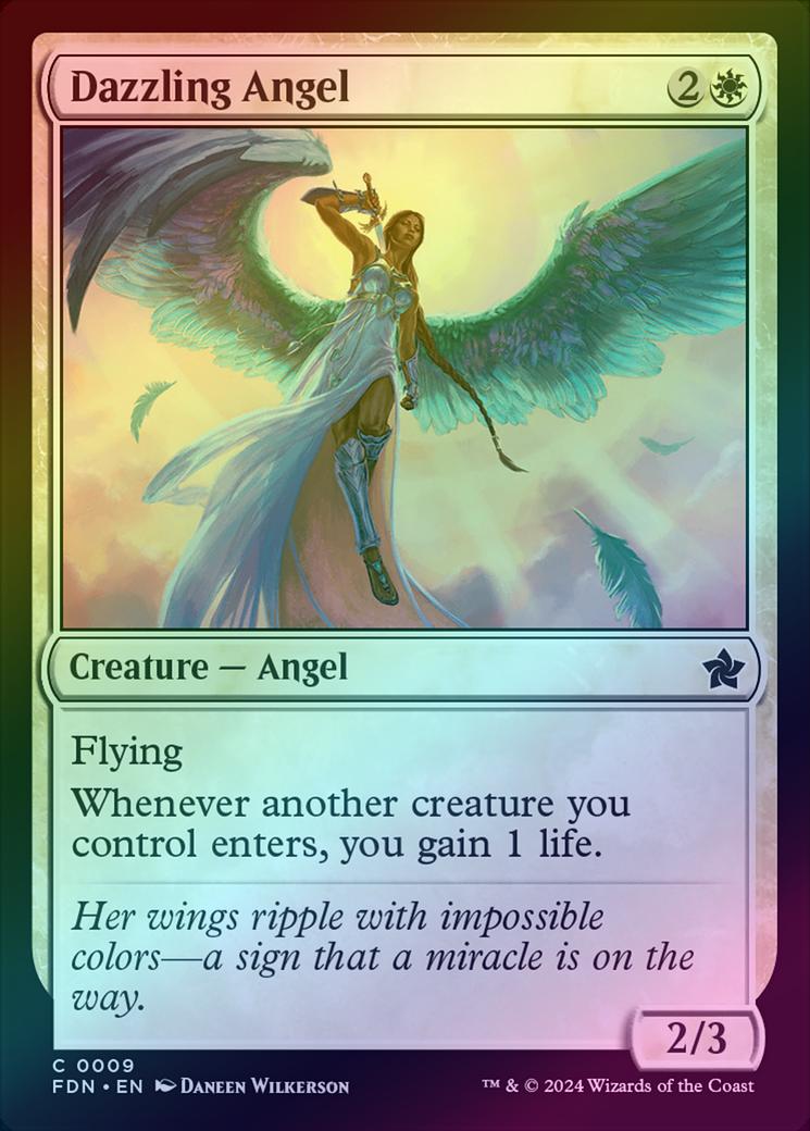 Dazzling AngelCasting Cost: Card Type: Creature - AngelPower/Toughness: 2/3Card Text: Flying Whenever another creature you control enters, you gain 1 life.Flavour Text: Her wings ripple with impossible colors-a sign that a miracle is on the way.Artist: Daneen Wilkerson
