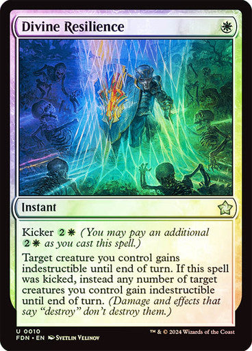 Divine ResilienceCasting Cost: Card Type: InstantCard Text: Kicker (You may pay an additional as you cast this spell.) Target creature you control gains indestructible until end of turn. If this spell was kicked, any number of target creatures you control gain indestructible until end of turn instead. (Damage and effects that say "destroy" don't destroy them.)Artist: Svetlin Velinov