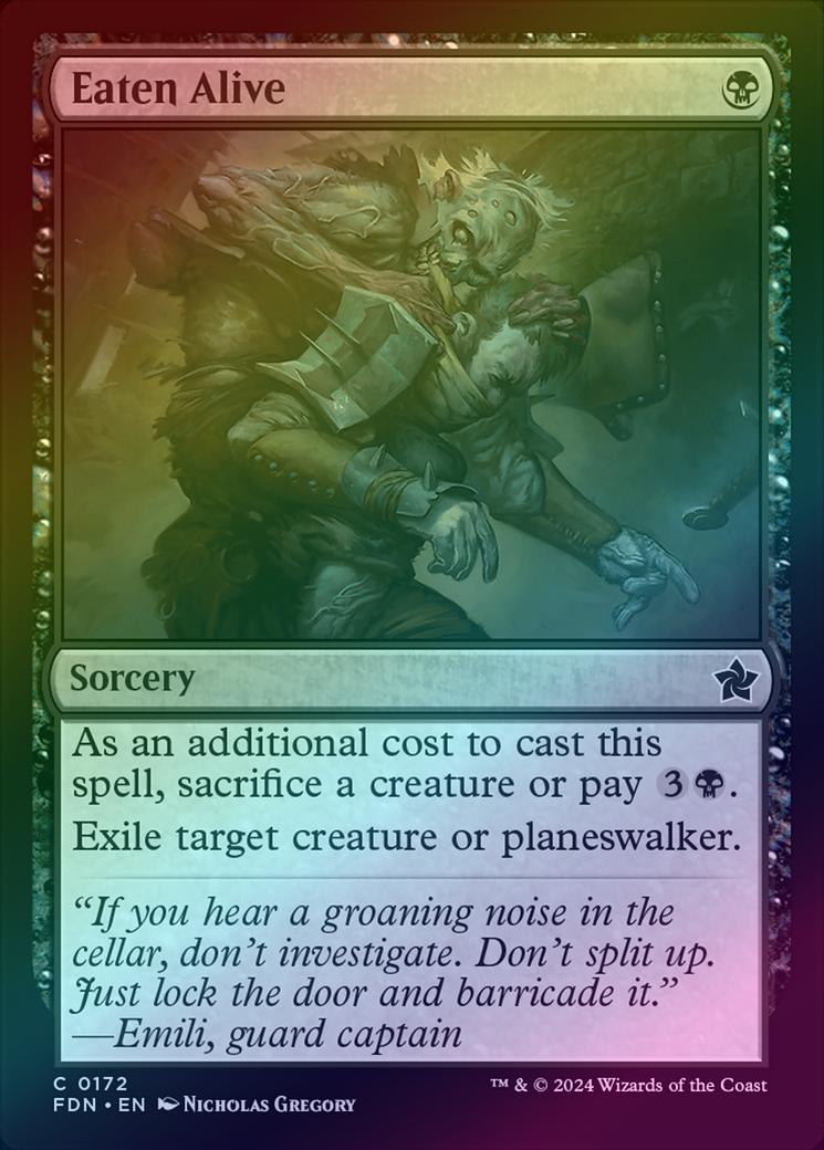 Eaten AliveCasting Cost: Card Type: SorceryCard Text: As an additional cost to cast this spell, sacrifice a creature or pay . Exile target creature or planeswalker.Flavour Text: "If you hear a groaning noise in the cellar, don't investigate. Don't split up. Just lock the door and barricade it." -Emili, guard captainArtist: Nicholas Gregory