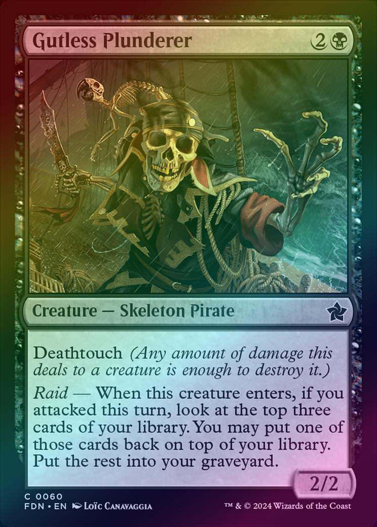Gutless PlundererCasting Cost: Card Type: Creature - Skeleton PiratePower/Toughness: 2/2Card Text: Deathtouch (Any amount of damage this deals to a creature is enough to destroy it.) Raid - When this creature enters, if you attacked this turn, look at the top three cards of your library. You may put one of those cards back on top of your library. Put the rest into your graveyard.Artist: Loc Canavaggia