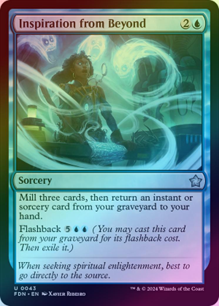 Inspiration from BeyondCasting Cost: Card Type: SorceryCard Text: Mill three cards, then return an instant or sorcery card from your graveyard to your hand. Flashback (You may cast this card from your graveyard for its flashback cost. Then exile it.)Flavour Text: When seeking spiritual enlightenment, best to go directly to the source.Artist: Xavier Ribeiro