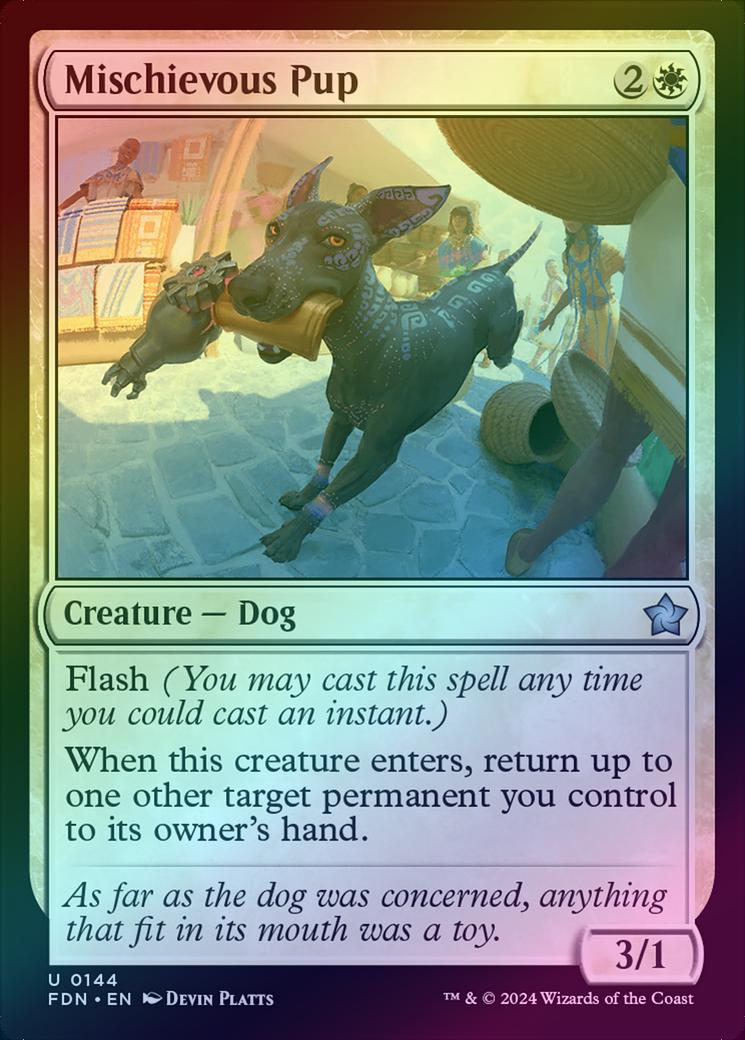 Mischievous PupCasting Cost: Card Type: Creature - DogPower/Toughness: 3/1Card Text: Flash When Mischievous Pup enters, return up to one other target permanent you control to its owner's hand.Flavour Text: As far as the dog was concerned, anything that fit in its mouth was a toy.Artist: Devin Platts