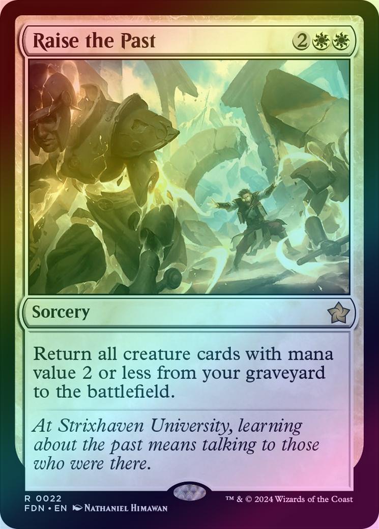 Raise the PastCasting Cost: Card Type: SorceryCard Text: Return all creature cards with mana value 2 or less from your graveyard to the battlefield.Flavour Text: At Strixhaven University, learning about the past means talking to those who were there.Artist: Nathaniel Himawan