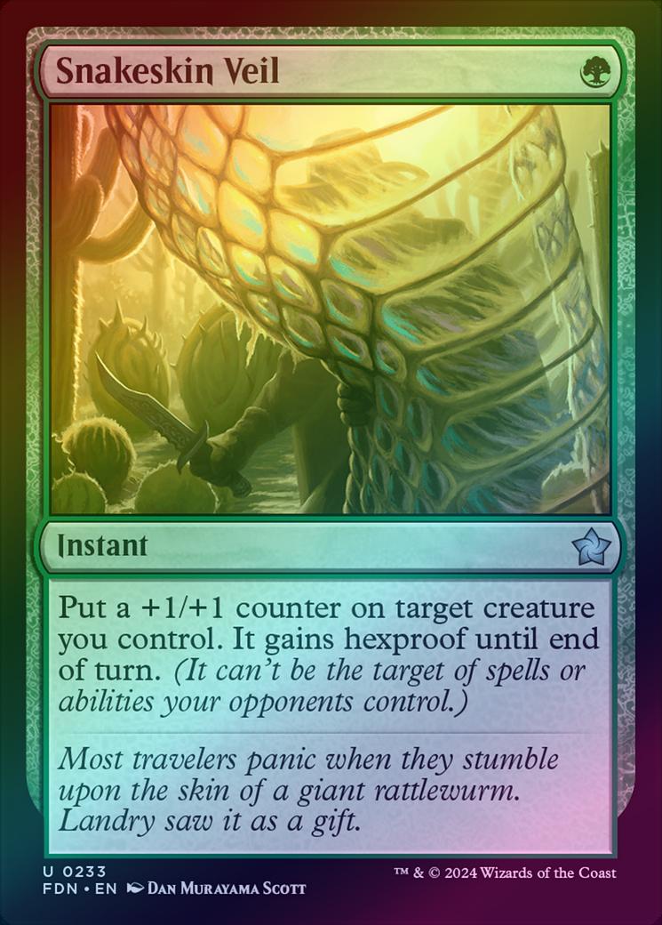 Snakeskin VeilCasting Cost: Card Type: InstantCard Text: Put a +1/+1 counter on target creature you control. It gains hexproof until end of turn. (It can't be the target of spells or abilities your opponents control.)Flavour Text: Most travelers panic when they stumble upon the skin of a giant rattlewurm. Landry saw it as a gift.Artist: Dan Murayama Scott