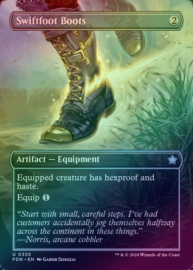 Swiftfoot BootsCasting Cost: Card Type: Artifact - EquipmentCard Text: Equipped creature has hexproof and haste. (It can't be the target of spells or abilities your opponents control.) Equip Flavour Text: "Start with small, careful steps. I've had customers accidentally jog themselves halfway across the continent in these things." -Norris, arcane cobblerArtist: Gabor Szikszai