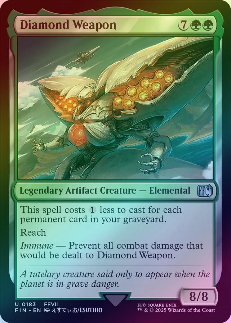 Diamond WeaponCasting Cost: Card Type: Legendary Artifact Creature - ElementalPower/Toughness: 8/8Card Text: This spell costs less to cast for each permanent card in your graveyard. Reach Immune - Prevent all combat damage that would be dealt to Diamond Weapon.Flavour Text: A tutelary creature said only to appear when the planet is in grave danger.Artist: Esuthio