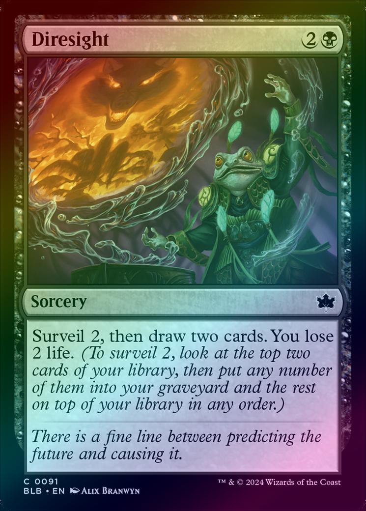 DiresightCasting Cost: Card Type: SorceryCard Text: Surveil 2, then draw two cards. You lose 2 life. (To surveil 2, look at the top two cards of your library, then put any number of them into your graveyard and the rest on top of your library in any order.)Flavour Text: There is a fine line between predicting the future and causing it.Artist: Alix Branwyn