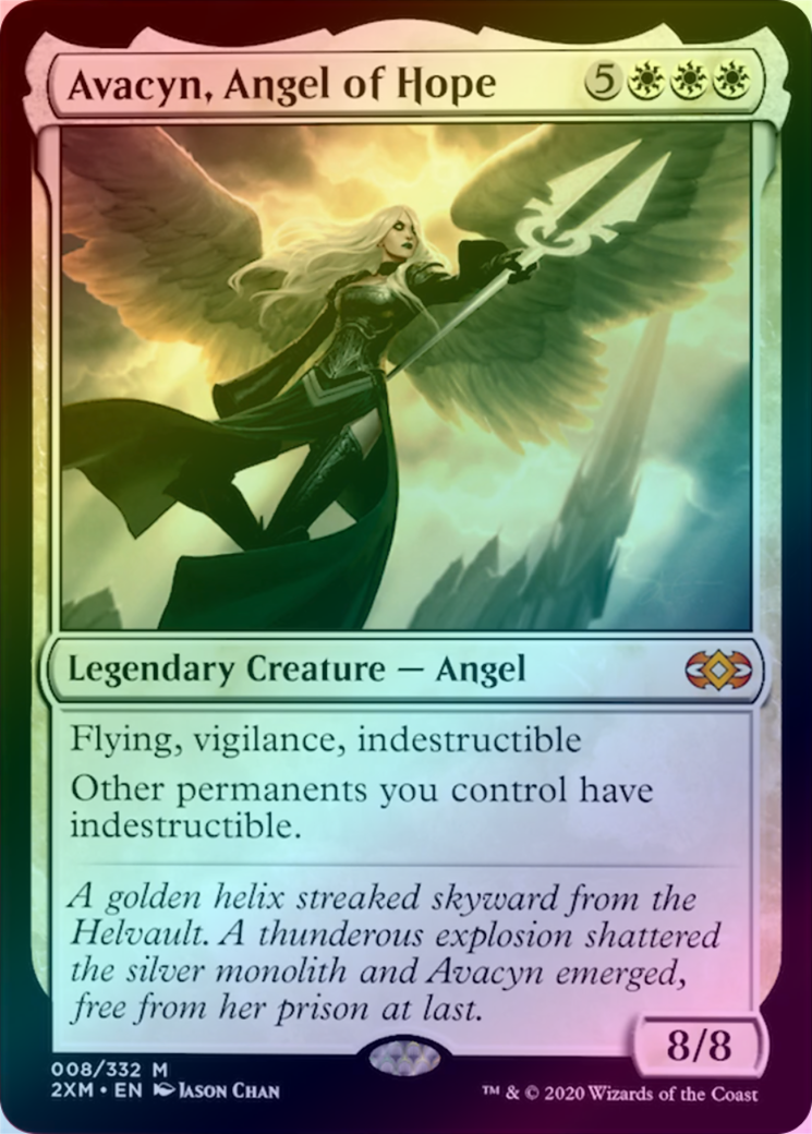 Avacyn, Angel of HopeCasting Cost: Card Type: Legendary Creature - AngelPower/Toughness: 8/8Card Text: Flying, vigilance, indestructible Other permanents you control have indestructible.Flavour Text: A golden helix streaked skyward from the Helvault. A thunderous explosion shattered the silver monolith and Avacyn emerged, free from her prison at last.Artist: Jason ChanRarity: Mythic