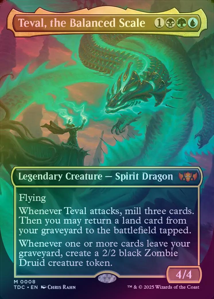 Teval, the Balanced ScaleCasting Cost: Card Type: Legendary Creature - Spirit DragonPower/Toughness: 4/4Card Text: Flying Whenever Teval attacks, mill three cards. Then you may return a land card from your graveyard to the battlefield tapped. Whenever one or more cards leave your graveyard, create a 2/2 black Zombie Druid creature token.Artist: Chris Rahn