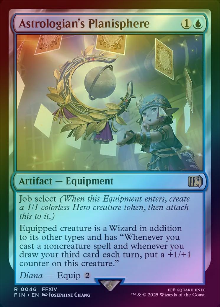 Astrologian's PlanisphereCasting Cost: Card Type: Artifact - EquipmentCard Text: Job select (When this Equipment enters, create a 1/1 colorless Hero creature token, then attach this to it.) Equipped creature is a Wizard in addition to its other types and has "Whenever you cast a noncreature spell and whenever you draw your third card each turn, put a +1/+1 counter on this creature." Diana - Equip Artist: Josephine Chang