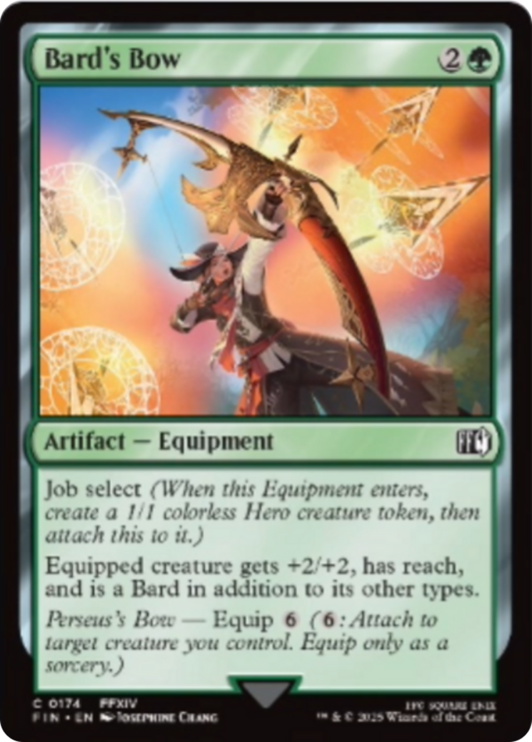 Bard's BowCasting Cost: Card Type: Artifact - EquipmentCard Text: Job select (When this Equipment enters, create a 1/1 colorless Hero creature token, then attach this to it.) Equipped creature gets +2/+2, has reach, and is a Bard in addition to its other types. Perseus's Bow - Equip (: Attach to target creature you control. Equip only as a sorcery.)Artist: Josephine Chang