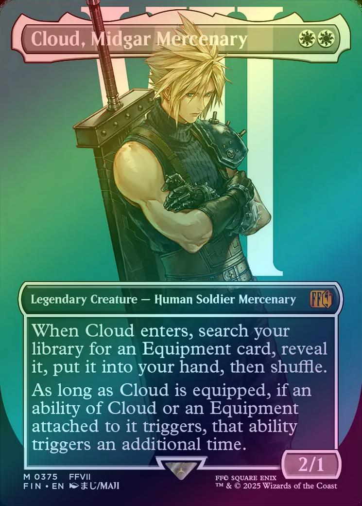 Cloud, Midgar MercenaryCasting Cost: Card Type: Legendary Creature - Human Soldier MercenaryPower/Toughness: 2/1Card Text: When Cloud enters, search your library for an Equipment card, reveal it, put it into your hand, then shuffle. As long as Cloud is equipped, if an ability of Cloud or an Equipment attached to it triggers, that ability triggers an additional time.Artist: Maji