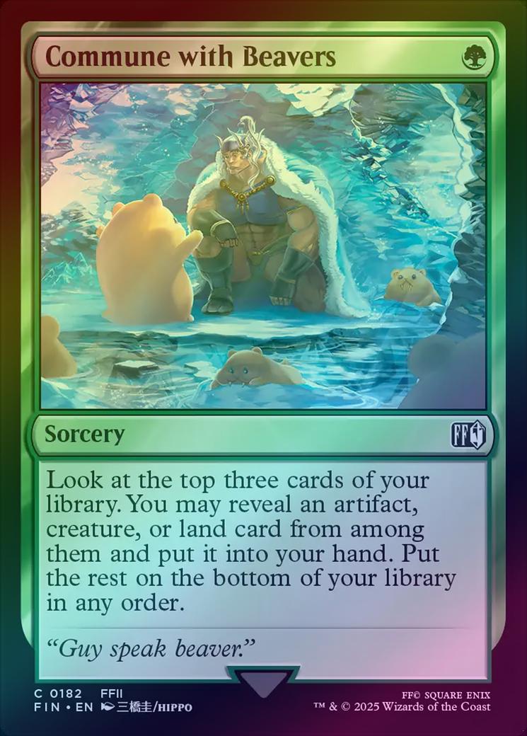 Commune with BeaversCasting Cost: Card Type: SorceryCard Text: Look at the top three cards of your library. You may reveal an artifact, creature, or land card from among them and put it into your hand. Put the rest on the bottom of your library in any order.Flavour Text: "Guy speak beaver."Artist: hippo