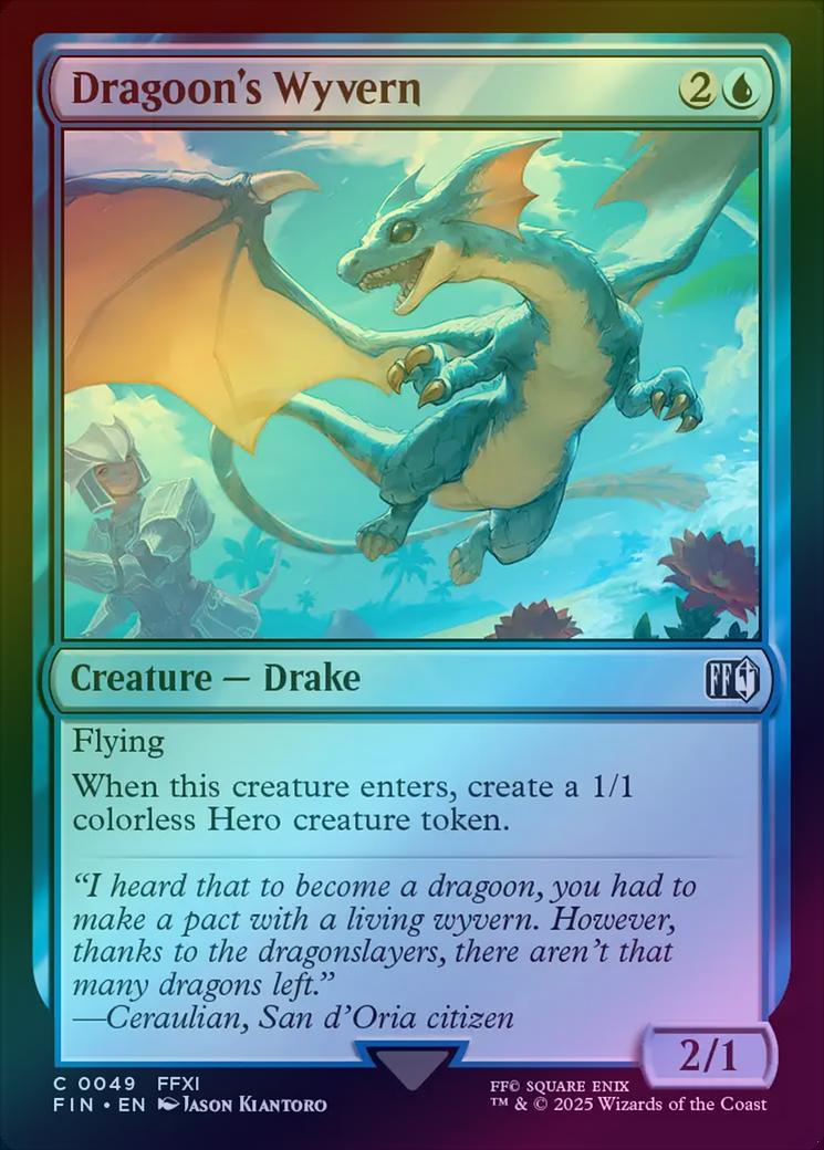 Dragoon's WyvernCasting Cost: Card Type: Creature - DrakePower/Toughness: 2/1Card Text: Flying When this creature enters, create a 1/1 colorless Hero creature token.Flavour Text: "I heard that to become a dragoon, you had to make a pact with a living wyvern. However, thanks to the dragonslayers, there aren't that many dragons left." -Ceraulian, San d'Oria citizenArtist: Jason Kiantoro