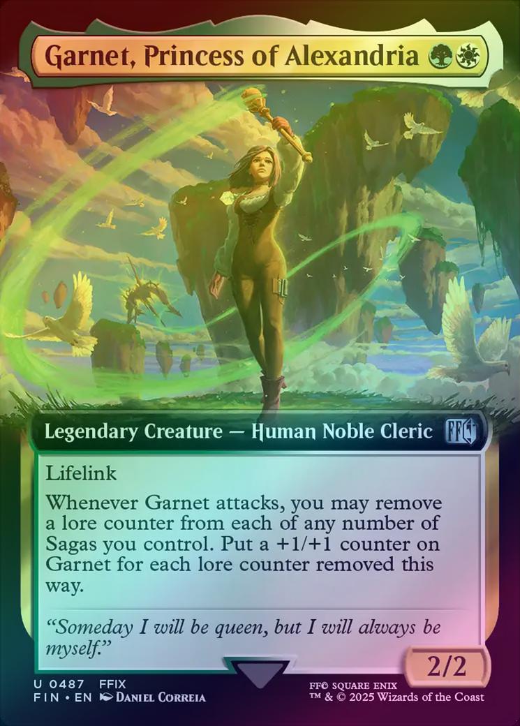 Garnet, Princess of AlexandriaCasting Cost: Card Type: Legendary Creature - Human Noble ClericPower/Toughness: 2/2Card Text: Lifelink Whenever Garnet attacks, you may remove a lore counter from each of any number of Sagas you control. Put a +1/+1 counter on Garnet for each lore counter removed this way.Flavour Text: "Someday I will be queen, but I will always be myself."Artist: Daniel Correia