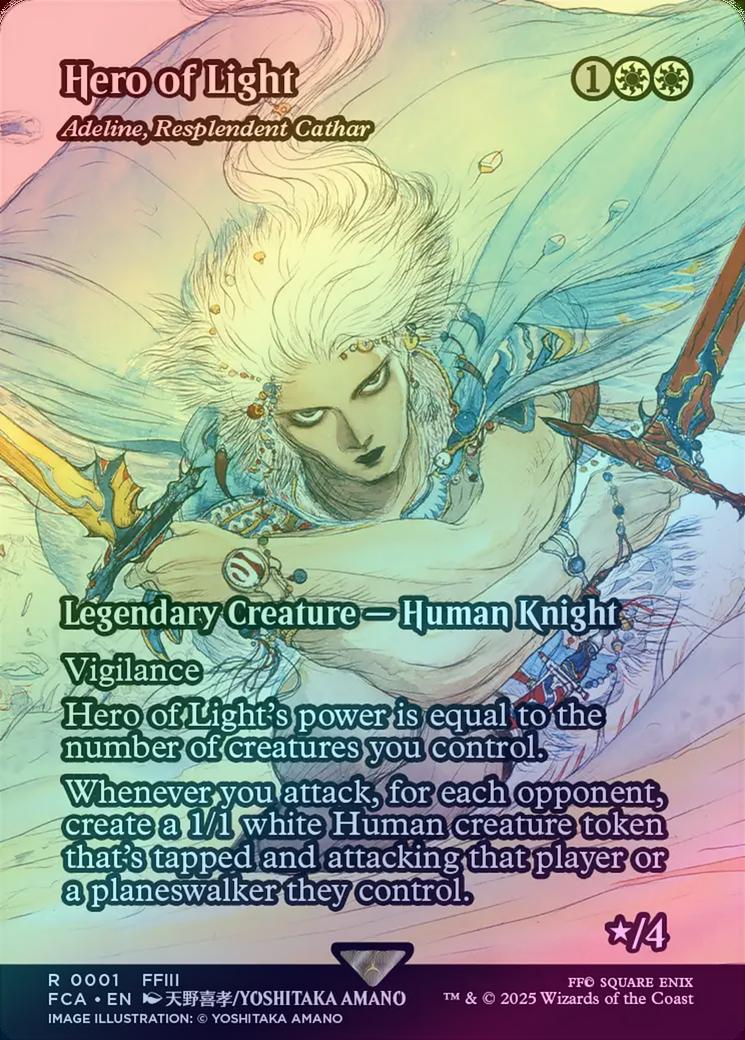 Adeline, Resplendent CatharCasting Cost: Card Type: Legendary Creature - Human KnightPower/Toughness: */4Card Text: Vigilance Adeline's power is equal to the number of creatures you control. Whenever you attack, for each opponent, create a 1/1 white Human creature token that's tapped and attacking that player or a planeswalker they control.Artist: Yoshitaka Amano