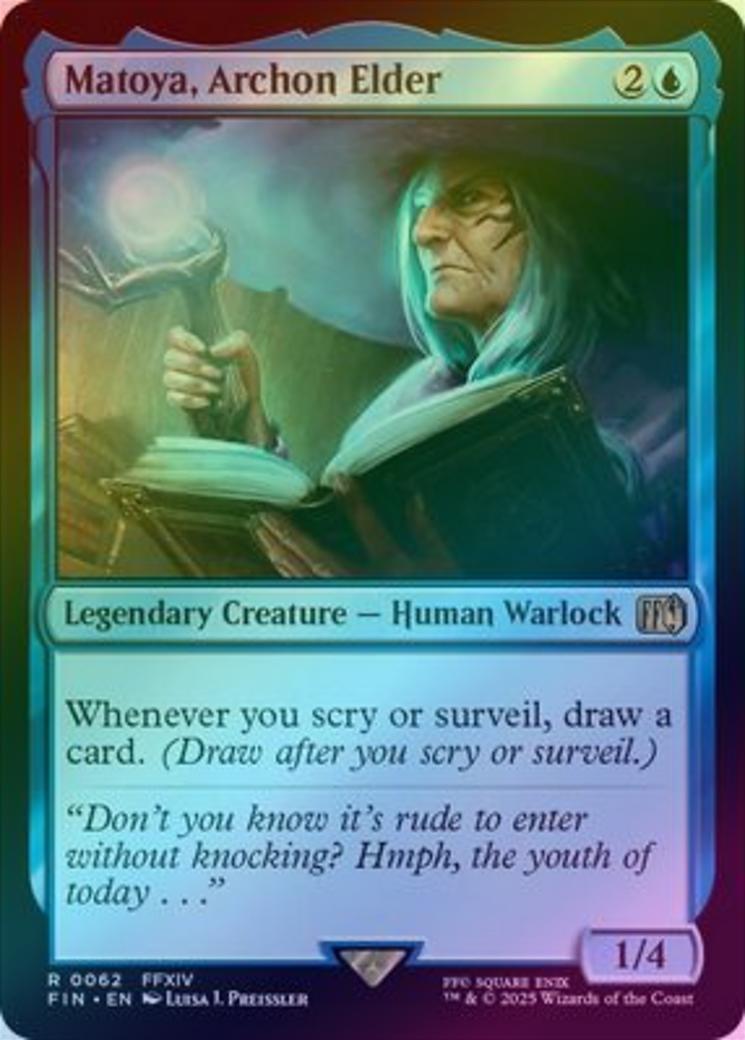 Matoya, Archon ElderCasting Cost: Card Type: Legendary Creature - Human WarlockPower/Toughness: 1/4Card Text: Whenever you scry or surveil, draw a card. (Draw after you scry or surveil.)Flavour Text: "Don't you know it's rude to enter without knocking? Hmph, the youth of today..."Artist: Luisa J. Preissler