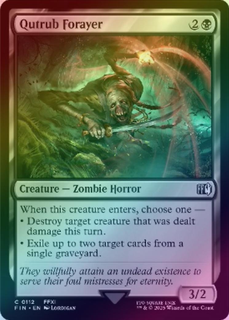 Qutrub ForayerCasting Cost: Card Type: Creature - Zombie HorrorPower/Toughness: 3/2Card Text: When this creature enters, choose one - - Destroy target creature that was dealt damage this turn. - Exile up to two target cards from a single graveyard.Flavour Text: They willfully attain an undead existence to serve their foul mistresses for eternity.Artist: Lordigan