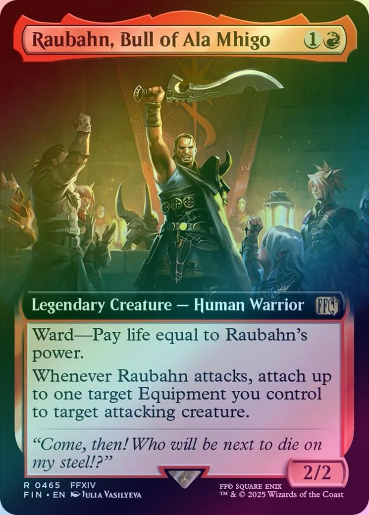 Raubahn, Bull of Ala MhigoCasting Cost: Card Type: Legendary Creature - Human WarriorPower/Toughness: 2/2Card Text: Ward-Pay life equal to Raubahn's power. Whenever Raubahn attacks, attach up to one target Equipment you control to target attacking creature.Flavour Text: "Come, then! Who will be next to die on my steel!?"Artist: Julia Vasilyeva