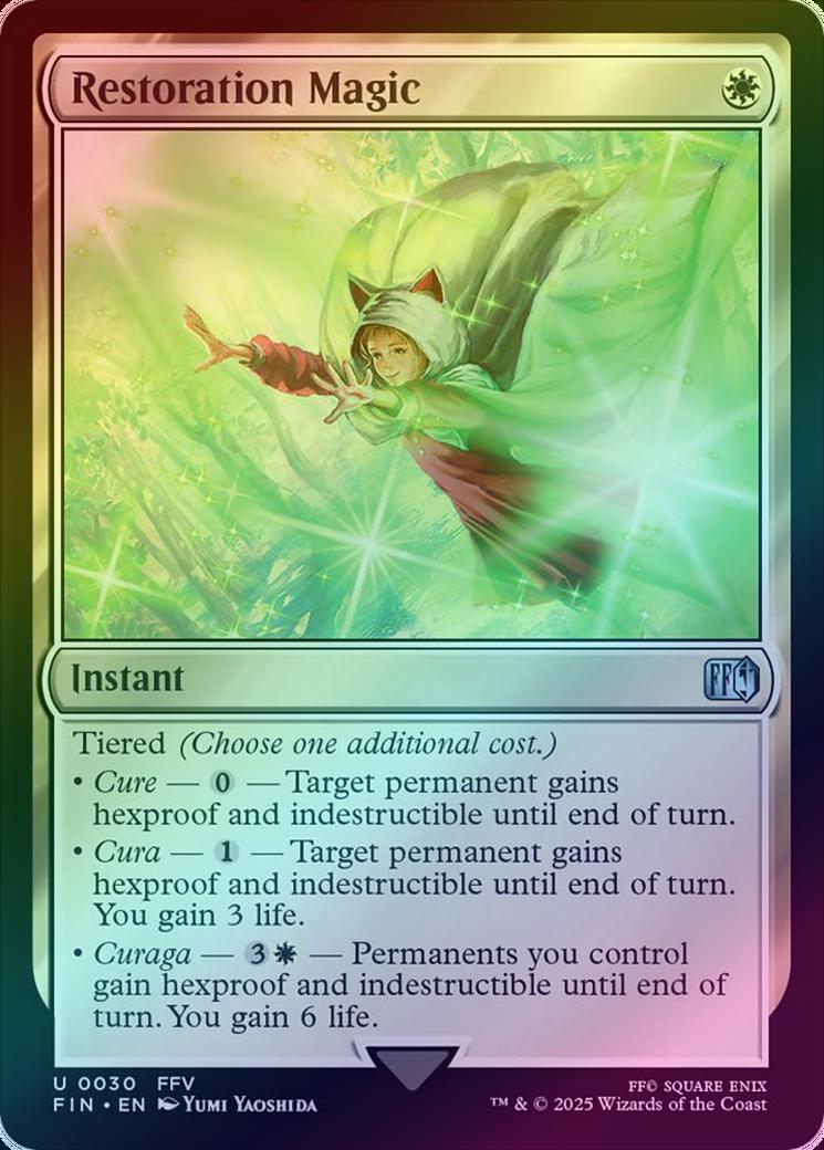 Restoration MagicCasting Cost: Card Type: InstantCard Text: Tiered (Choose one additional cost.) - Cure - - Target permanent gains hexproof and indestructible until end of turn. - Cura - - Target permanent gains hexproof and indestructible until end of turn. You gain 3 life. - Curaga - - Permanents you control gain hexproof and indestructible until end of turn. You gain 6 life.Artist: Yumi Yaoshida