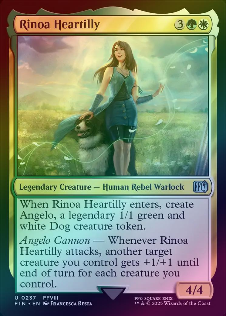 Rinoa HeartillyCasting Cost: Card Type: Legendary Creature - Human Rebel WarlockPower/Toughness: 4/4Card Text: When Rinoa Heartilly enters, create Angelo, a legendary 1/1 green and white Dog creature token. Angelo Cannon - Whenever Rinoa Heartilly attacks, another target creature you control gets +1/+1 until end of turn for each creature you control.Artist: Francesca Resta