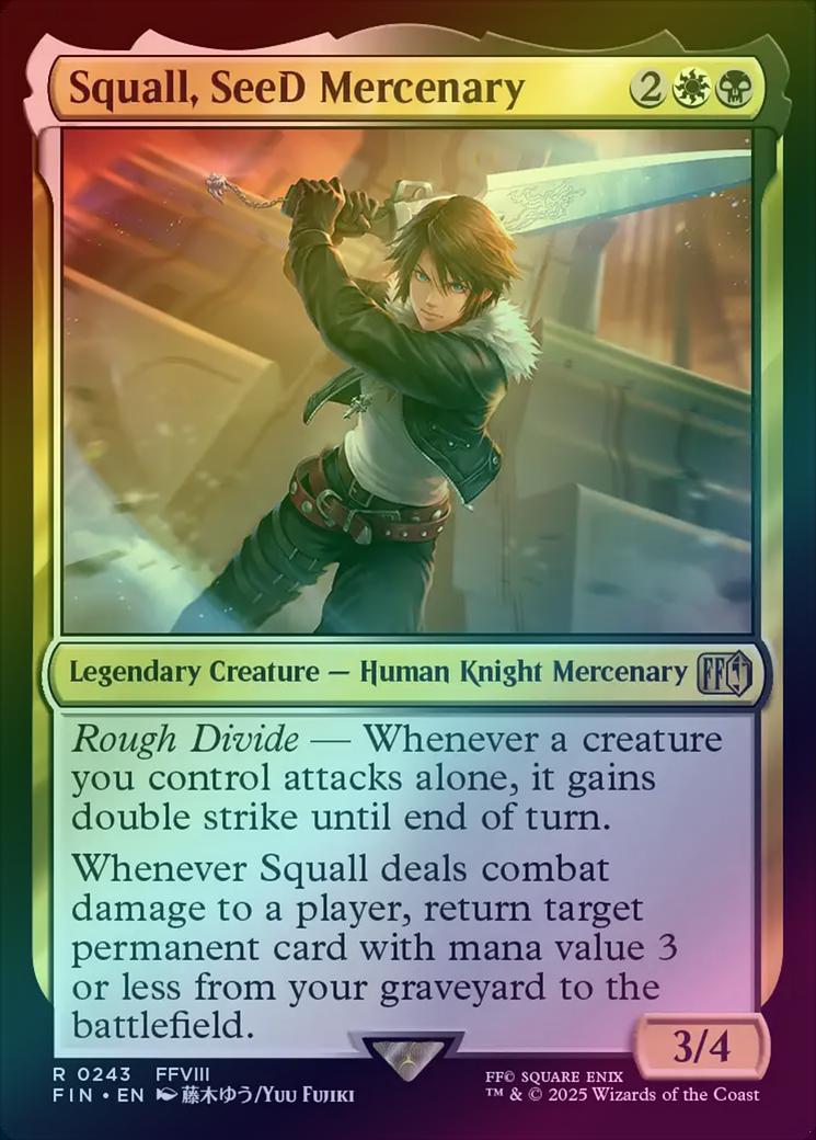 Squall, SeeD MercenaryCasting Cost: Card Type: Legendary Creature - Human Knight MercenaryPower/Toughness: 3/4Card Text: Rough Divide - Whenever a creature you control attacks alone, it gains double strike until end of turn. Whenever Squall deals combat damage to a player, return target permanent card with mana value 3 or less from your graveyard to the battlefield.Artist: Yuu Fujiki