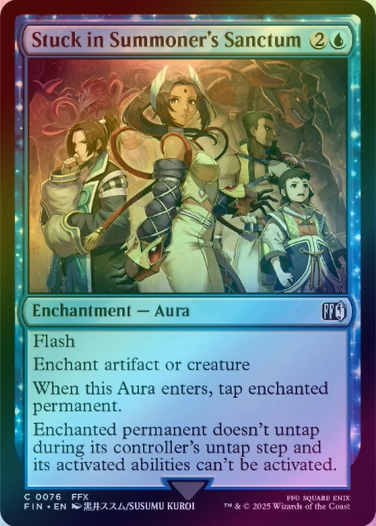 Stuck in Summoner's SanctumCasting Cost: Card Type: Enchantment - AuraCard Text: Flash Enchant artifact or creature When this Aura enters, tap enchanted permanent. Enchanted permanent doesn't untap during its controller's untap step and its activated abilities can't be activated.Artist: Susumu Kuroi