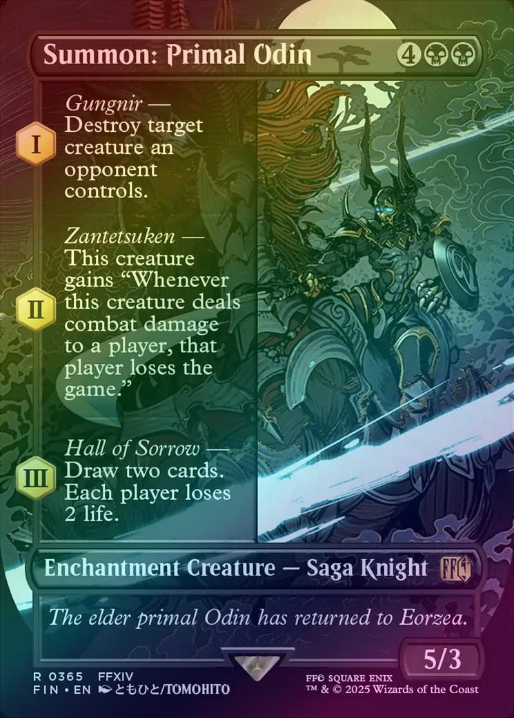 Summon: Primal OdinCasting Cost: Card Type: Enchantment Creature - Saga KnightPower/Toughness: 5/3Card Text: (As this Saga enters and after your draw step, add a lore counter. Sacrifice after III.) I - Gungnir - Destroy target creature an opponent controls. II - Zantetsuken - This creature gains "Whenever this creature deals combat damage to a player, that player loses the game." III - Hall of Sorrow - Draw two cards. Each player loses 2 life.Flavour Text: The elder primal Odin has returned to Eorzea.Artist: Tomohito