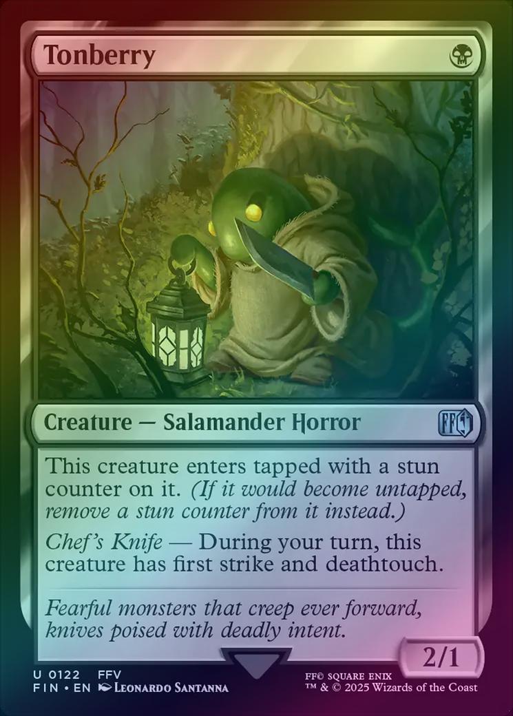 TonberryCasting Cost: Card Type: Creature - Salamander HorrorPower/Toughness: 2/1Card Text: This creature enters tapped with a stun counter on it. (If it would become untapped, remove a stun counter from it instead.) Chef's Knife - During your turn, this creature has first strike and deathtouch.Flavour Text: Fearful monsters that creep ever forward, knives poised with deadly intent.Artist: Leonardo Santanna
