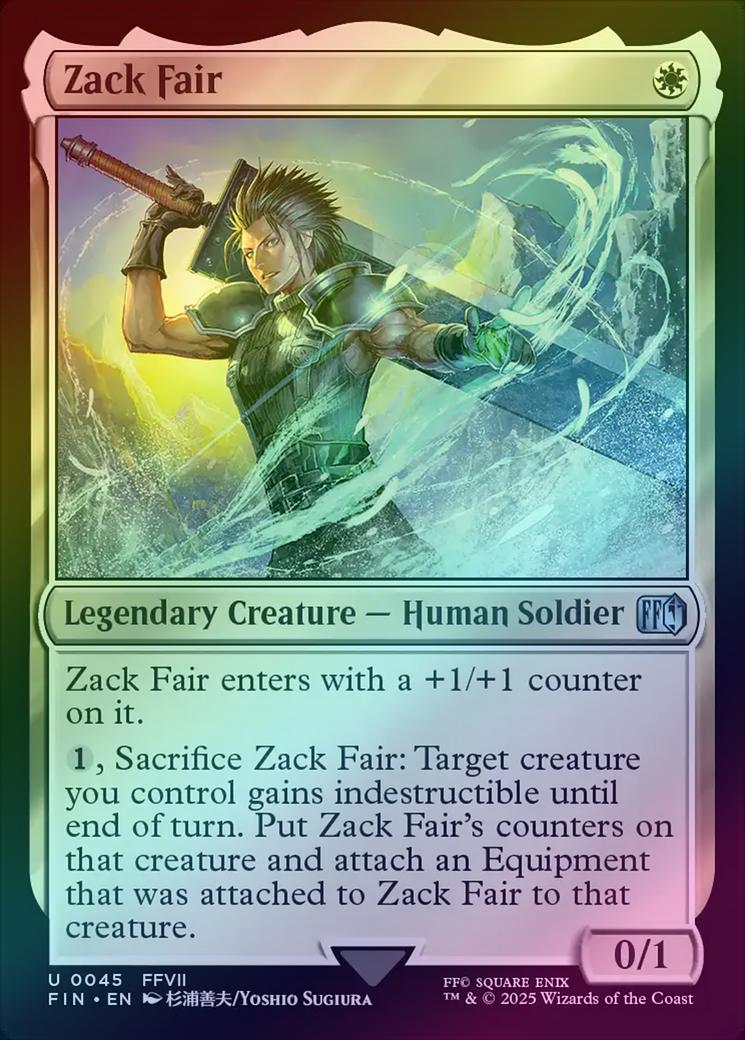 Zack FairCasting Cost: Card Type: Legendary Creature - Human SoldierPower/Toughness: 0/1Card Text: Zack Fair enters with a +1/+1 counter on it. , Sacrifice Zack Fair: Target creature you control gains indestructible until end of turn. Put Zack Fair's counters on that creature and attach an Equipment that was attached to Zack Fair to that creature.Artist: Yoshio Sugiura
