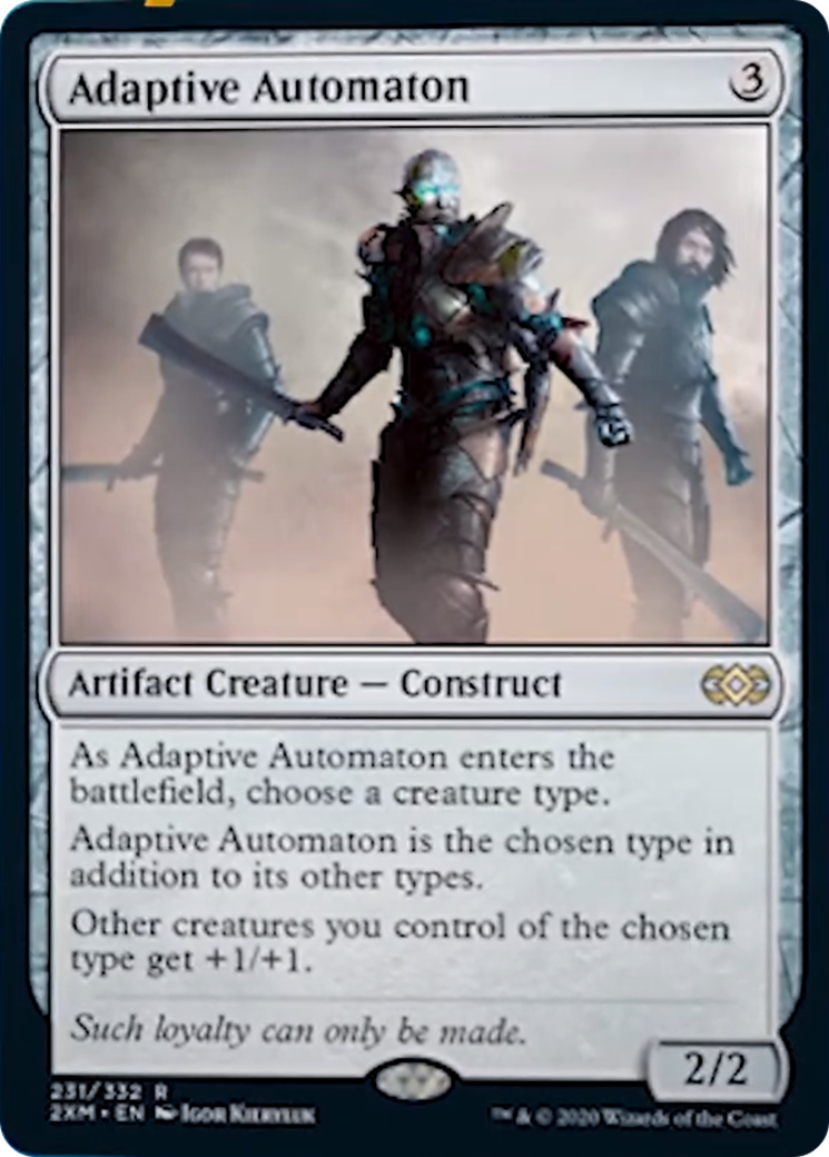 Adaptive AutomatonCasting Cost: Card Type: Artifact Creature - ConstructPower/Toughness: 2/2Card Text: As Adaptive Automaton enters the battlefield, choose a creature type. Adaptive Automaton is the chosen type in addition to its other types. Other creatures you control of the chosen type get +1/+1.Flavour Text: Such loyalty can only be made.