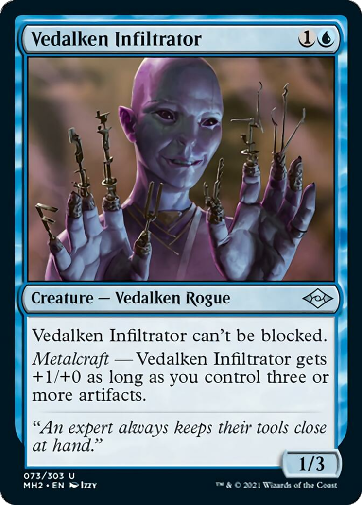 Vedalken InfiltratorCasting Cost: Card Type: Creature - Vedalken RoguePower/Toughness: 1/3Card Text: Vedalken Infiltrator can't be blocked. Metalcraft - Vedalken Infiltrator gets +1/+0 as long as you control three or more artifacts.Flavour Text: "An expert always keeps their tools close at hand."Artist: Izzy