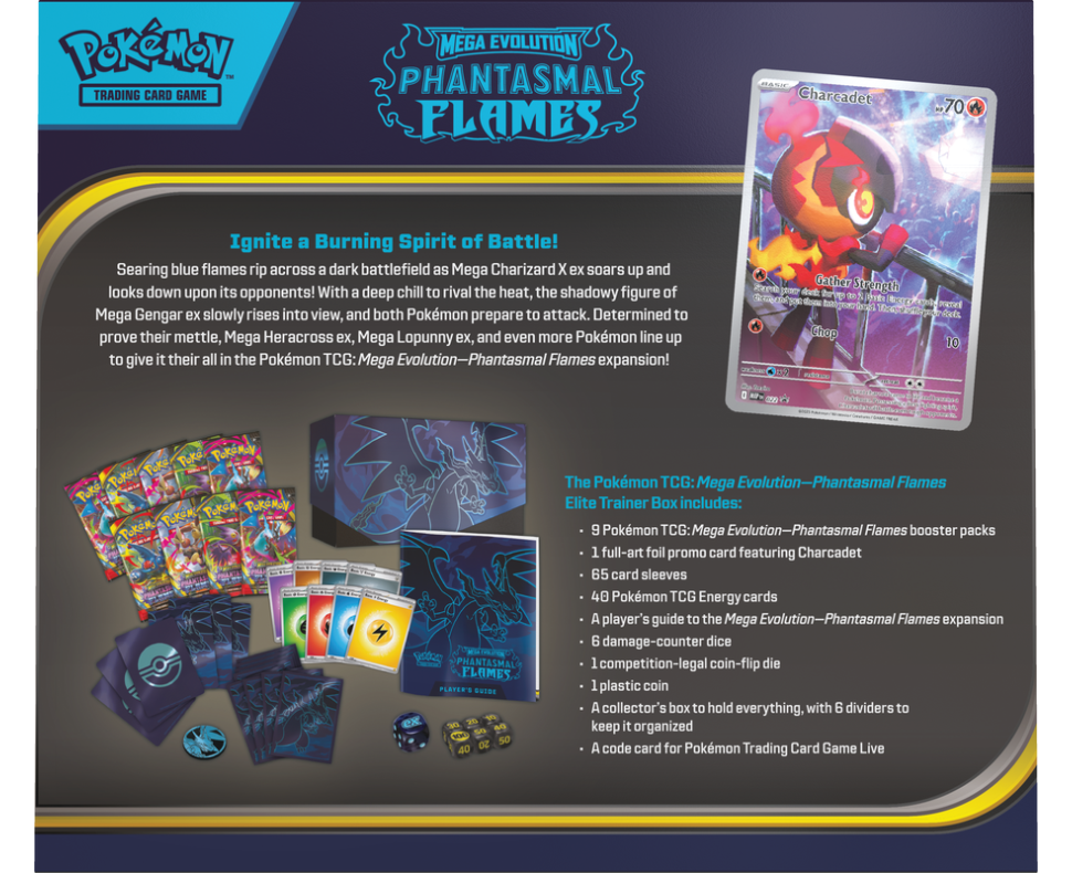 The Pokémon TCG: Mega Evolution—Phantasmal Flames Elite Trainer Box includes: