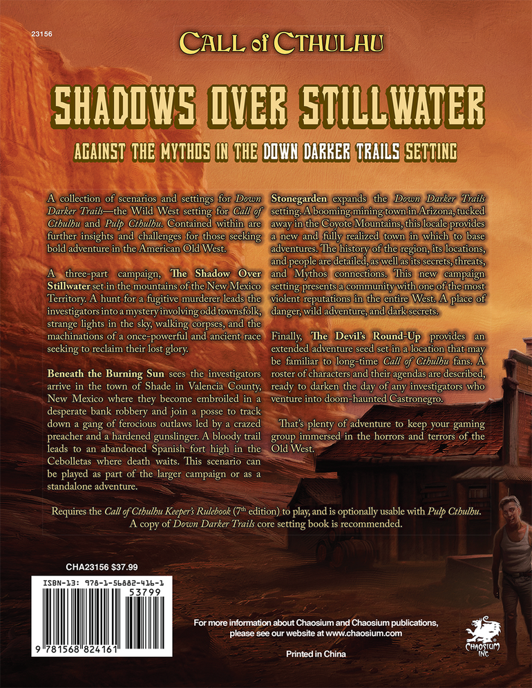 A three-part campaign, The Shadow Over Stillwater set in the mountains of the New Mexico Territory. A hunt for a fugitive murderer leads the investigators into a mystery involving odd townsfolk, strange lights in the sky, walking corpses, and the machinations of a once-powerful and ancient race seeking to reclaim their lost glory.