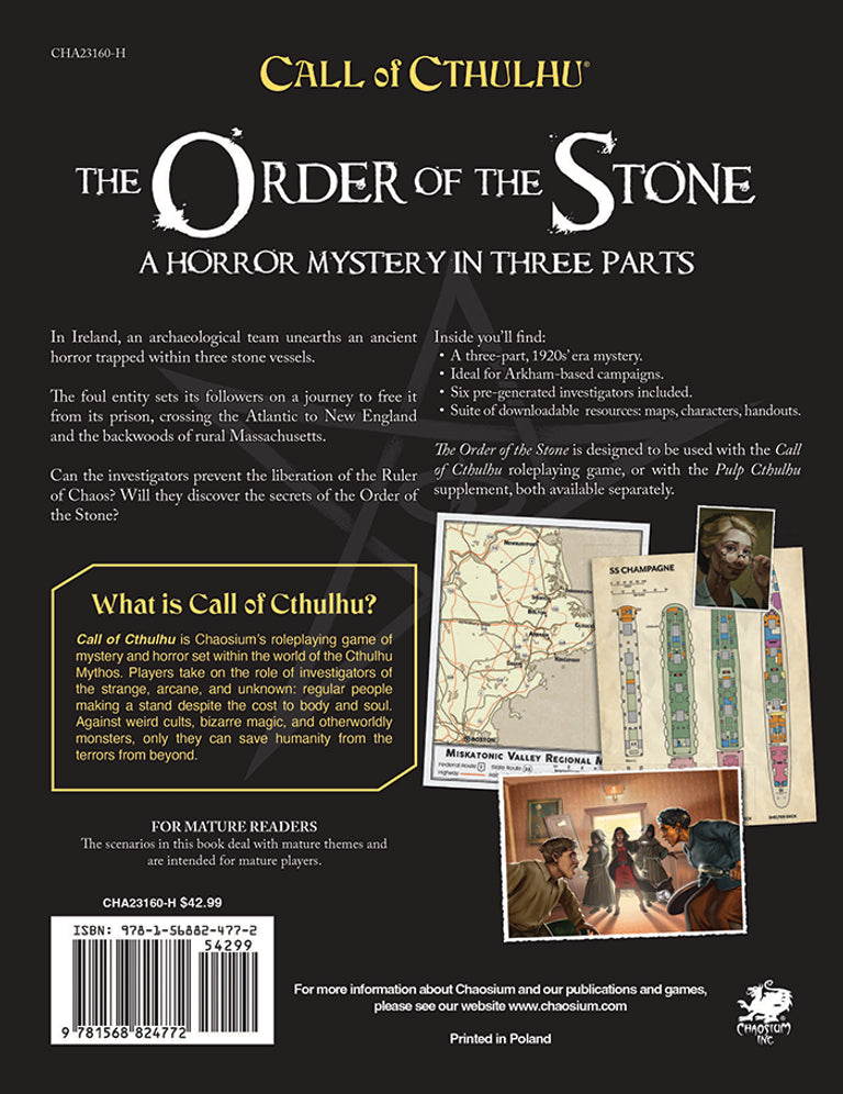 The Order of the Stone is designed to be used with the Call of Cthulhu roleplaying game, or with the Pulp Cthulhu supplement.