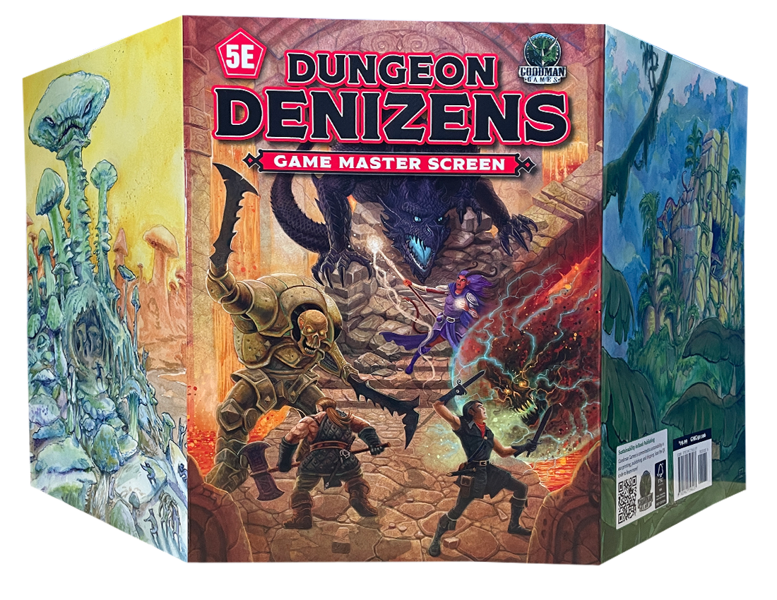 The Dungeon Denizens Game Master Screen is a cardstock 3-panel screen with full-color art on one side, and 5E game material on the opposite side. Suitable to use with Dungeon Denizens, or any monsters from your 5E campaign setting.
