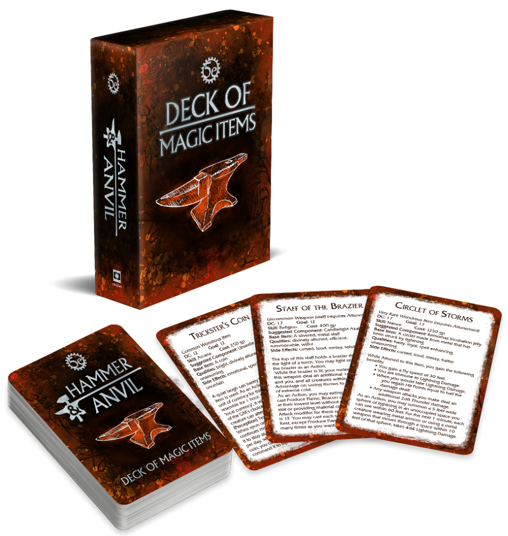 This card deck make it easy to keep track of your gear! The Deck of Magic Items includes all the artifacts and enchanted gear from Hammer & Anvil.