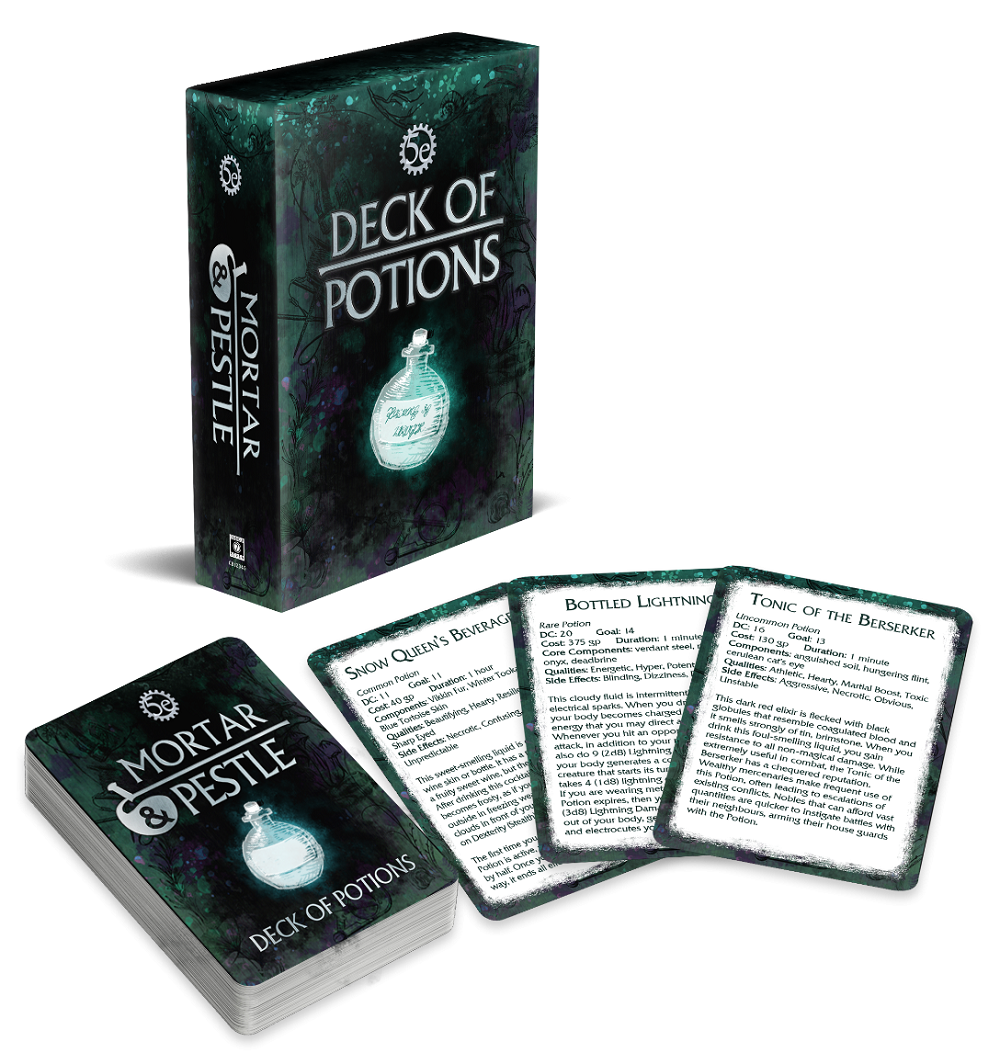 These card decks make it easy to keep track of your potions! The Deck of Potions includes all of the elixirs and concoctions you’ll find in Mortar & Pestle.
