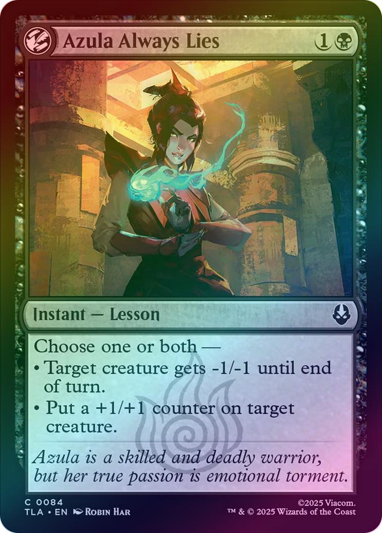 Azula Always LiesCasting Cost: Card Type: Instant - LessonCard Text: Choose one or both - - Target creature gets -1/-1 until end of turn. - Put a +1/+1 counter on target creature.Flavour Text: Azula is a skilled and deadly warrior, but her true passion is emotional torment.Artist: Robin Har