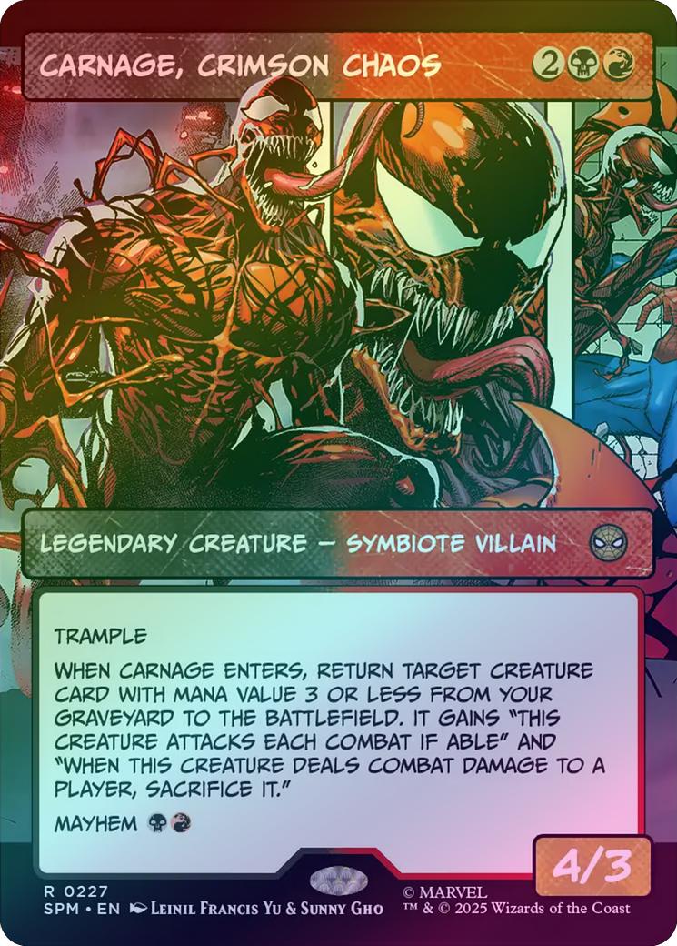Carnage, Crimson ChaosCasting Cost: Card Type: Legendary Creature - Symbiote VillainPower/Toughness: 4/3Card Text: Trample When Carnage enters, return target creature card with mana value 3 or less from your graveyard to the battlefield. It gains "This creature attacks each combat if able" and "When this creature deals combat damage to a player, sacrifice it." Mayhem Artist: Leinil Francis Yu & Sunny Gho