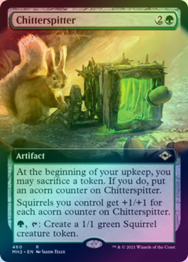 ChitterspitterCasting Cost: Card Type: ArtifactCard Text: At the beginning of your upkeep, you may sacrifice a token. If you do, put an acorn counter on Chitterspitter. Squirrels you control get +1/+1 for each acorn counter on Chitterspitter. , : Create a 1/1 green Squirrel creature token.Artist: Jason Felix