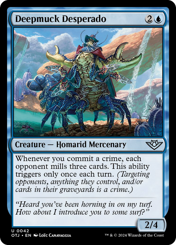 Deepmuck DesperadoCasting Cost: Card Type: Creature - Homarid MercenaryPower/Toughness: 2/4Card Text: Whenever you commit a crime, each opponent mills three cards. This ability triggers only once each turn. (Targeting opponents, anything they control, and/or cards in their graveyards is a crime.)Flavour Text: "Heard you've been horning in on my turf. How about I introduce you to some surf?"Artist: Loc Canavaggia