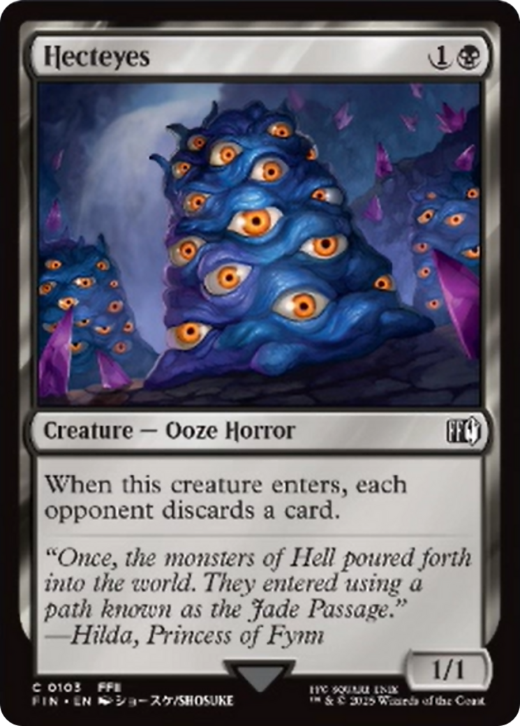HecteyesCasting Cost: Card Type: Creature - Ooze HorrorPower/Toughness: 1/1Card Text: When this creature enters, each opponent discards a card.Flavour Text: "Once, the monsters of Hell poured forth into the world. They entered using a path known as the Jade Passage." -Hilda, Princess of FynnArtist: SHOSUKE