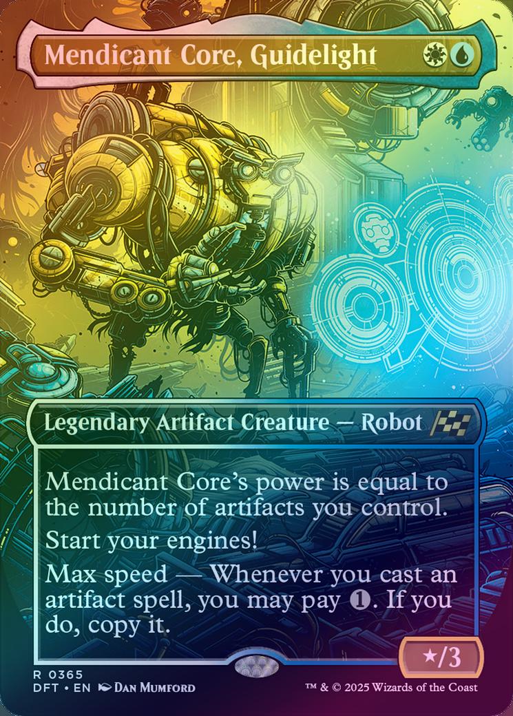 Mendicant Core, GuidelightCasting Cost: Card Type: Legendary Artifact Creature - RobotPower/Toughness: */3Card Text: Mendicant Core's power is equal to the number of artifacts you control. Start your engines! (If you have no speed, it starts at 1. It increases once on each of your turns when an opponent loses life. Max speed is 4.) Max speed - Whenever you cast an artifact spell, you may pay . If you do, copy it. (The copy becomes a token.)Artist: Dan Mumford