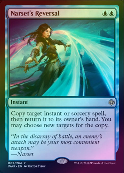 p>span class='cardname'>Narset's ReversalCasting Cost: Card Type: InstantCard Text: Copy target instant or sorcery spell, then return it to its owner's hand. You may choose new targets for the copy.Flavour Text: "In the disarray of battle, an enemy's attack may be your most convenient weapon." -NarsetArtist: Viktor TitovRarity: Rare